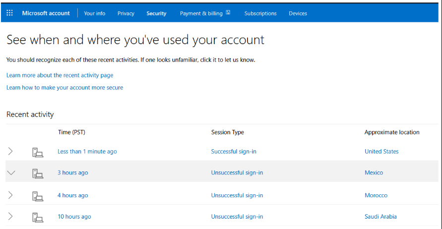 In a recent example, someone received a message about odd login attempts on their Microsoft account. Instead of clicking the link, they went directly to account.live.com/activity. There, they confirmed multiple login attempts from countries like South Africa, Brazil, Ukraine, and France, but because the hackers didn't have the 2FA codes, the account stayed secure.