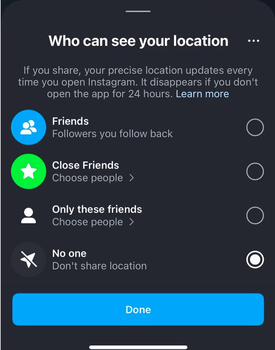 Instagram offers four choices for sharing your location. You can share with everyone you follow who also follows you back, only with your close friends, with specific people you choose, or with no one at all, which is the default. If you enable sharing, your location updates will be sent each time you open the Instagram app.