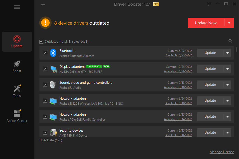 Doing this manually can be a huge pain, as you have to go to the website of each manufacturer of each part (video card, sound card, etc.), find the file to download, and install it, so I prefer a program like Driver Booster.