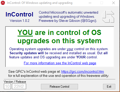 They certainly won’t conveniently bundle new features in a future release of Windows 10, as 22H2 is the last major update. In that case, InControl prevents automatic upgrades to Windows 11. Your system will remain on version 22H2 until you again deliberately “release control”.