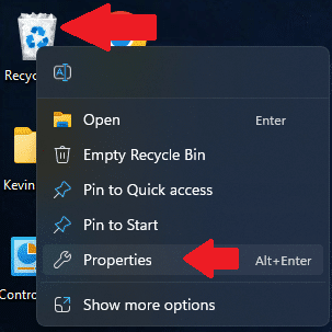 Then, right-click on the Recycle Bin and click on "Properties".