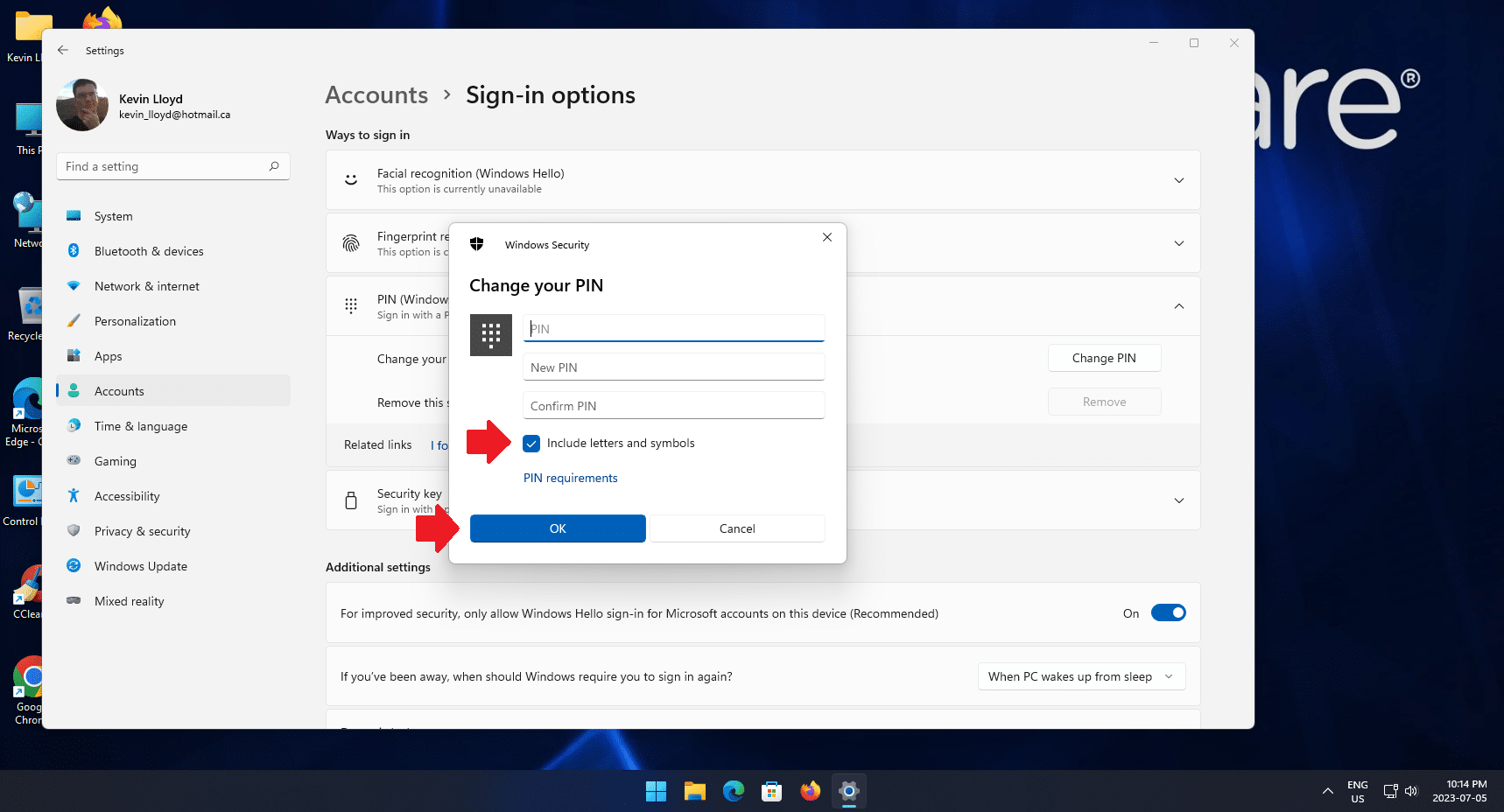 Click the "Change PIN" button, and ensure the checkbox next to "Include letters and symbols" is checked. Then enter your new password.