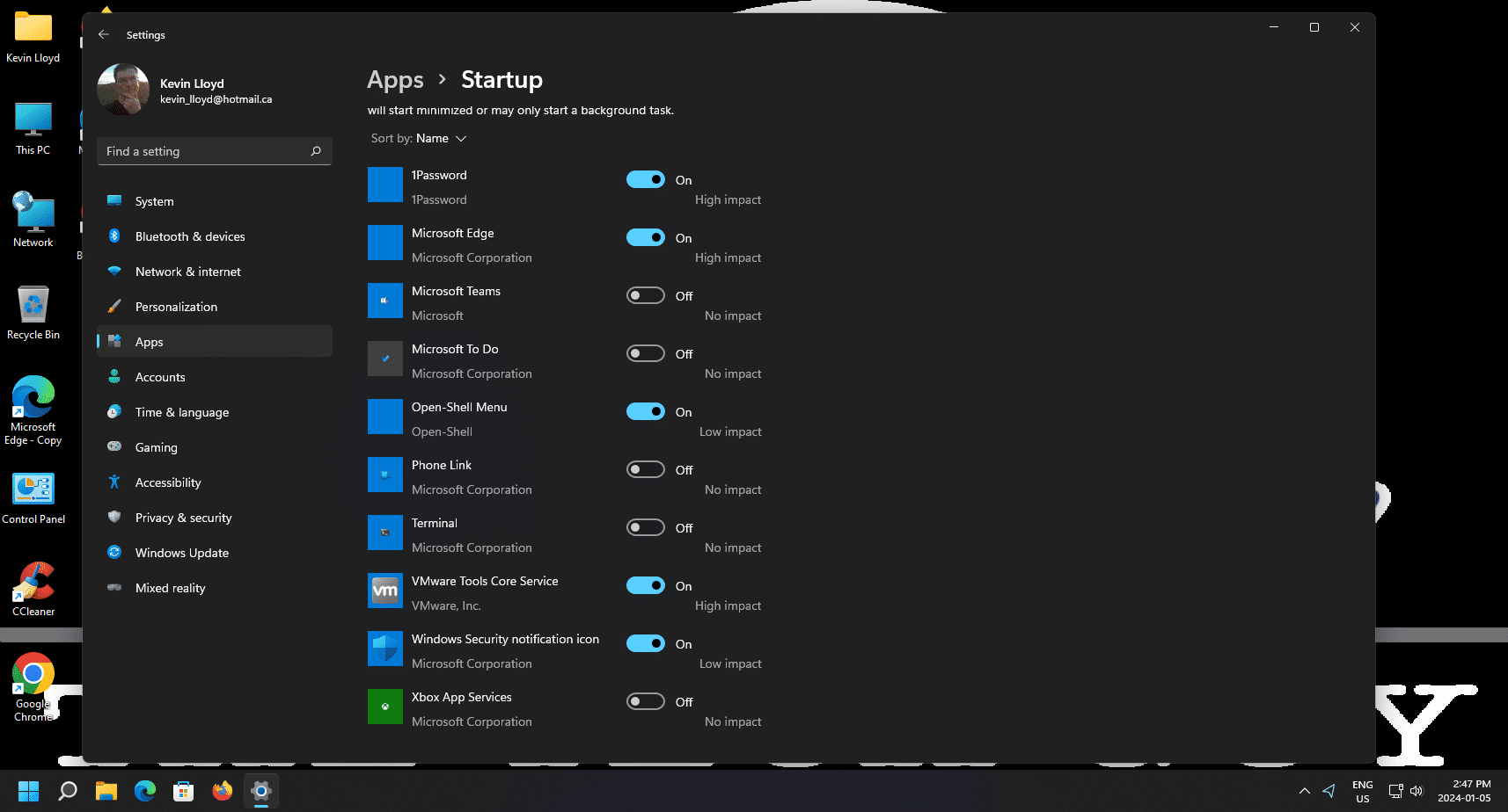 You will now see a list of applications automatically running when you turn on your computer and log into Windows 11. Every computer will be different regarding which apps are listed here. The list may be long or short.