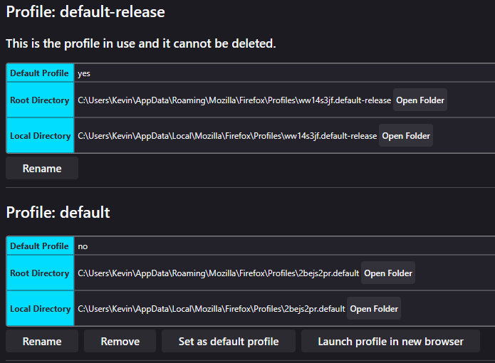 Click “Open Folder” next to your active profile. This opens a deeply buried folder in your Windows system that contains your Firefox profile data. You’ll see names like default-release. Once Firefox is closed, you can safely delete that folder.