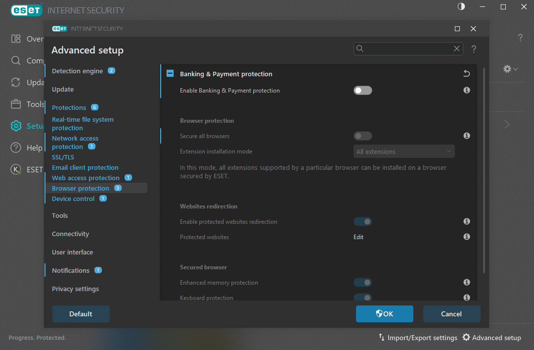 When you surf the web, don’t you love bright, constantly visible borders? Go ahead and enlarge the above screenshot by double-clicking it to see what I mean. That apparently indicates that ESET has activated certain features related to "banking protection". Who wants to surf the web with that visible? No one. Is it even necessary? Not at all.